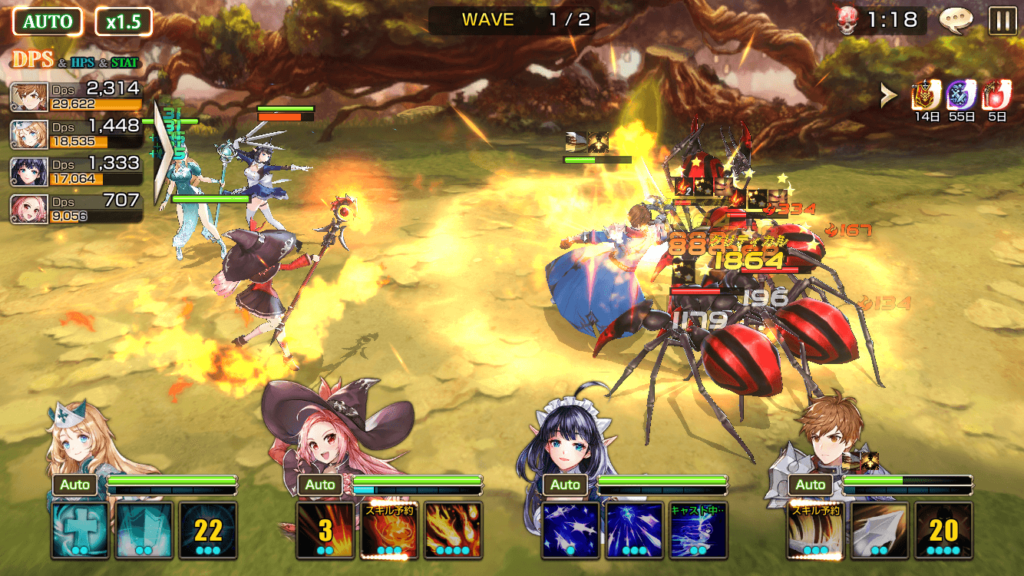 スキルは自分の任意のタイミングで発動できるので、完全オートバトルということではなく、スキルのタイミングや順番は各自で判断しなければならないので、スキルのタイミングに戦略性を持たせています。